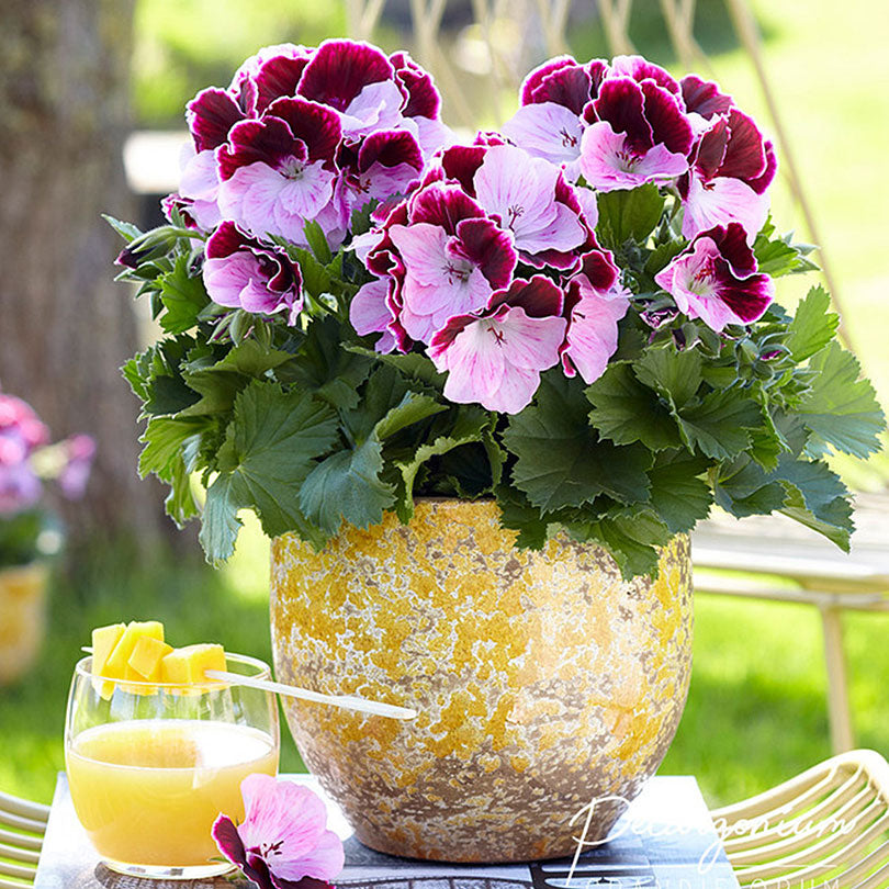The Regal geranium is not winter hardy. Before the first night frost, we put the plant in a light and cool place (7-10 degrees). We cut the branches back a little and remove the old leaves. Place the plant in full sun. Water the Pelargonium immediately after planting. Then we give them a bit of water every morning. Keep the root ball moist. For even more profuse blooming, we add some plant food to its water every week.