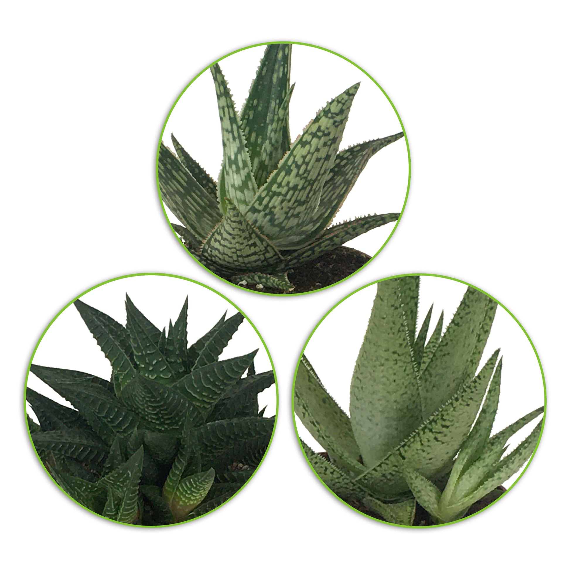 An extremely strong mix featuring the succulents 'Snow Flake' (Aloe rauhii), 'Red Flame' (Aloe variegata) and 'King' (Aloe vera). The 'Snow flake' makes a nice adornment to your living room with its sturdy, white-speckled leaves. The 'Red Flame' is a good contrast with its red serrated edges. The 'King' is a prominent complement to the mix.