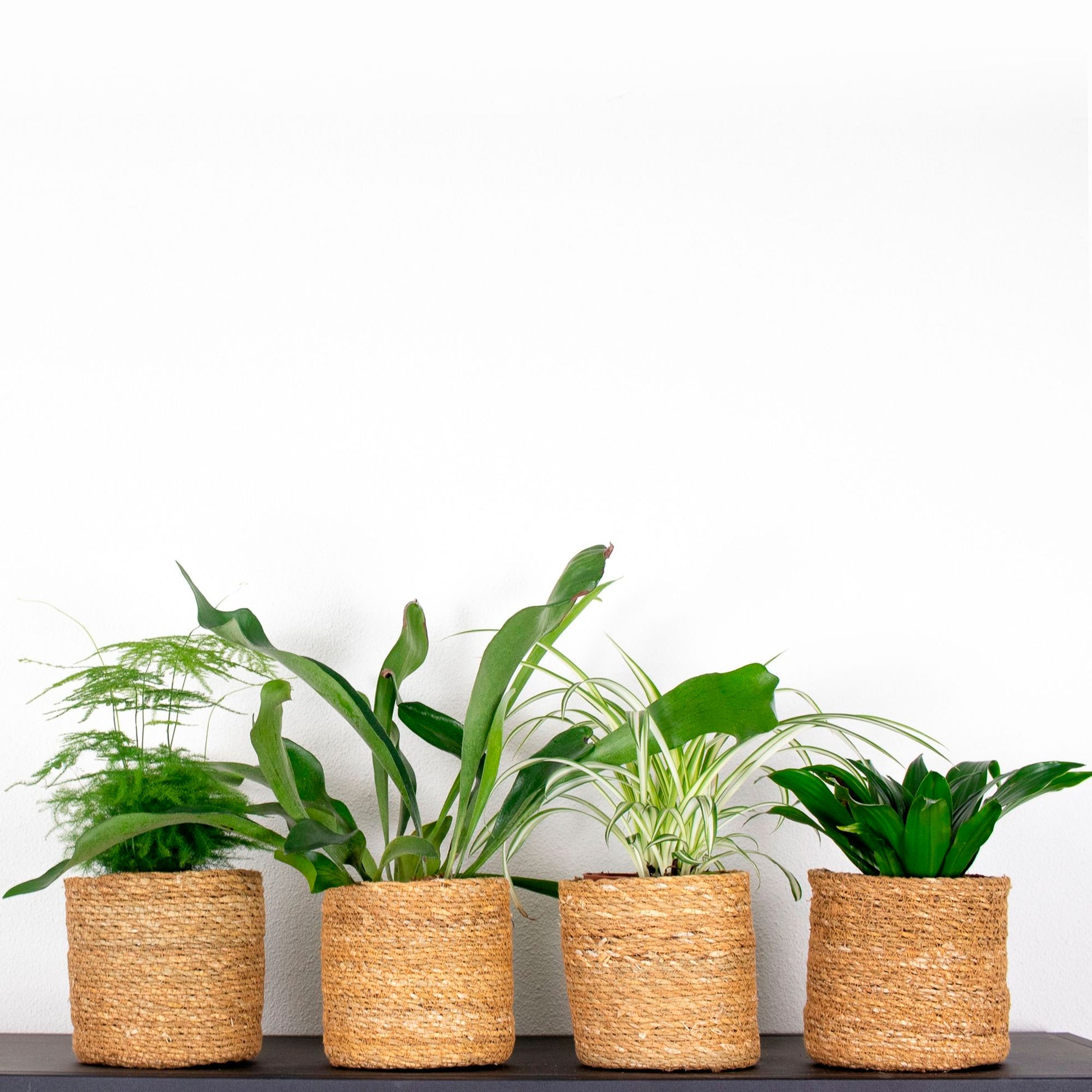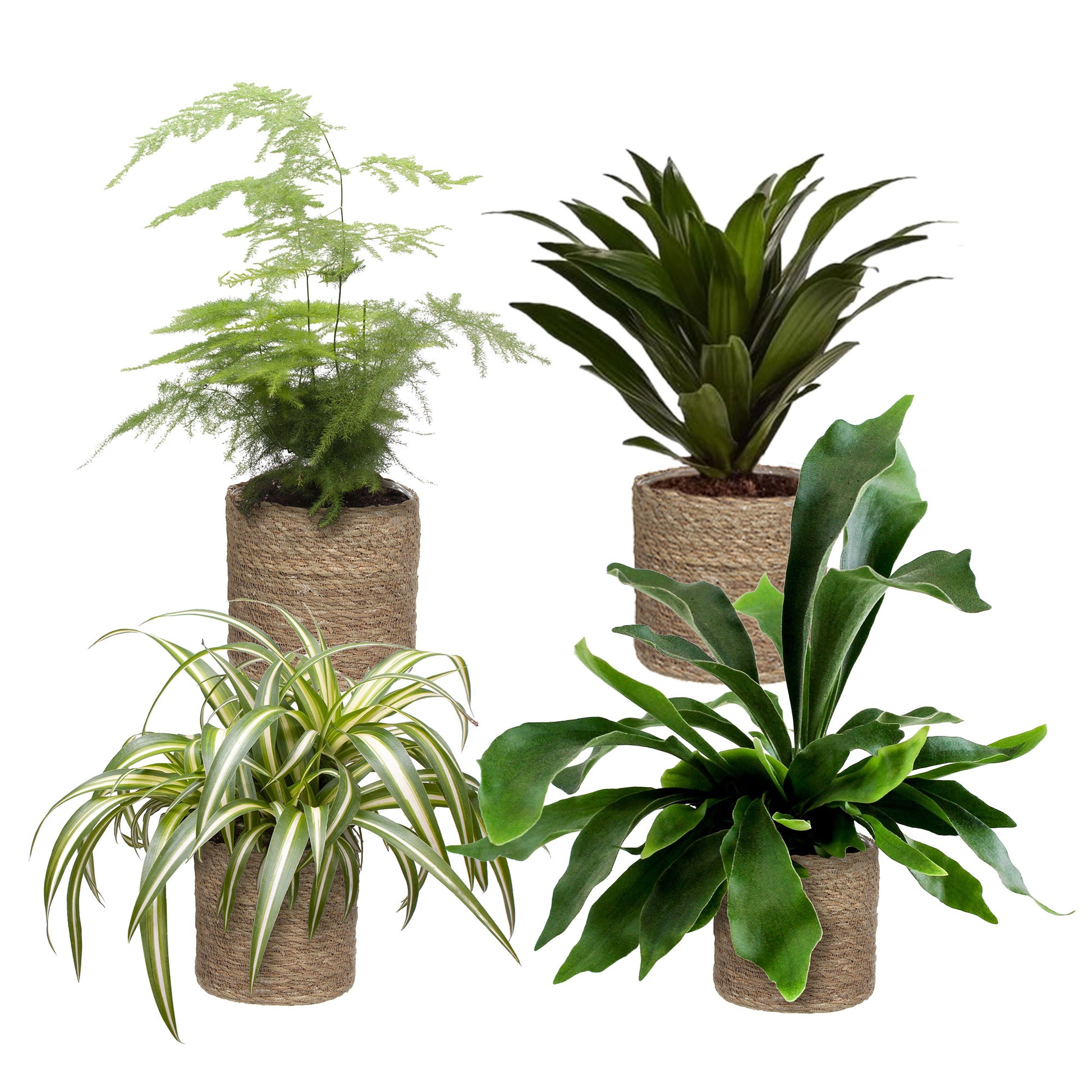 For a trendy touch in your home! With this mix of trendy, green indoor plants. Ready for use in lovely brown baskets. A mix of the spider plant 'Varigatum', the stag horn fern 'Asparagus', the asparagus fern 'Plumosa' and the dragon tree 'Compacta'. How charming!
