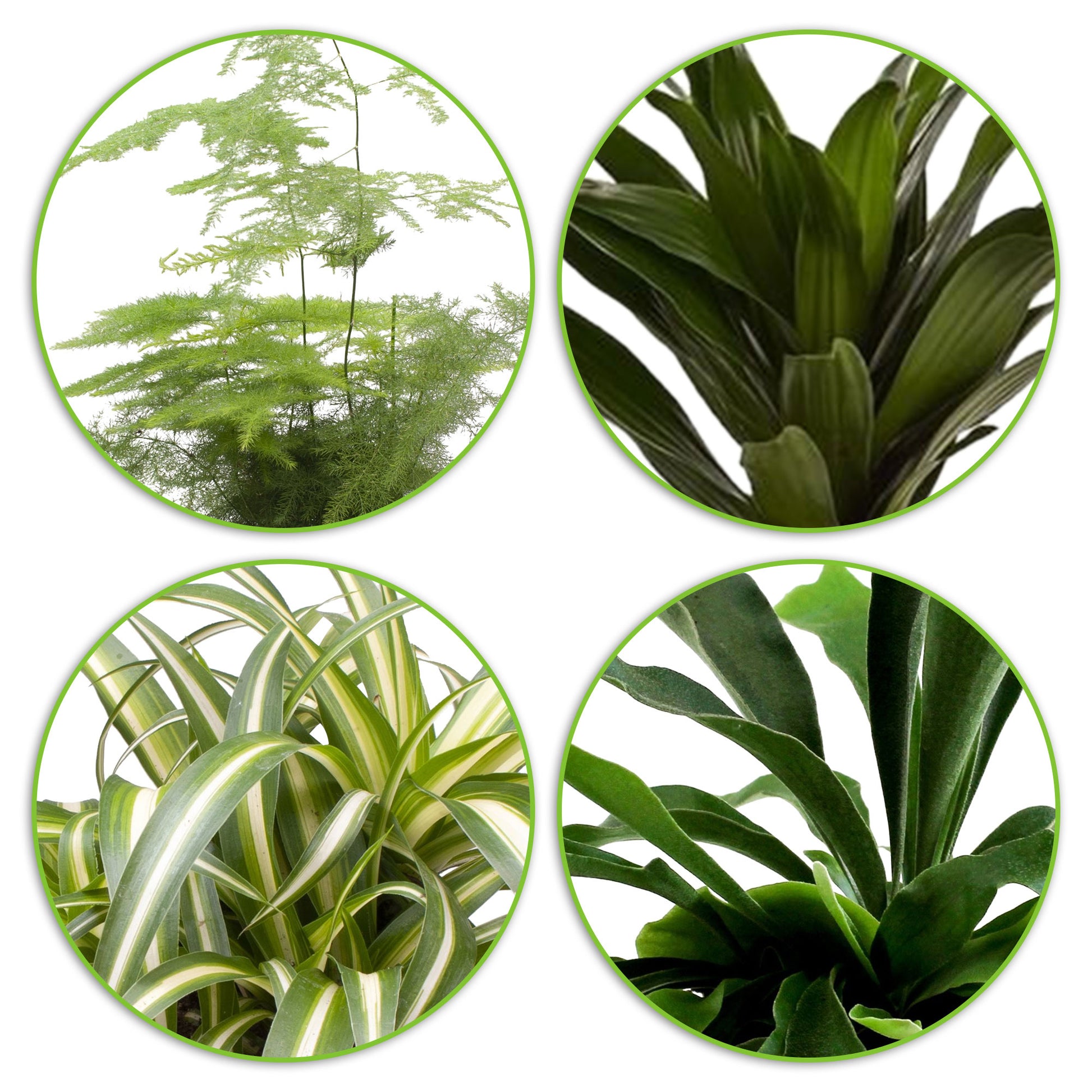 The mix will purify your house. The leaves capture contaminated particles and convert them into oxygen. Complete with attractive, decorative pots. Keep the soil moist, but make sure that the plants aren't standing in water. Spray the leaves of the dragon tree and the staghorn fern with water occasionally so that the leaf edges do not dry out. The plants come with brown baskets.