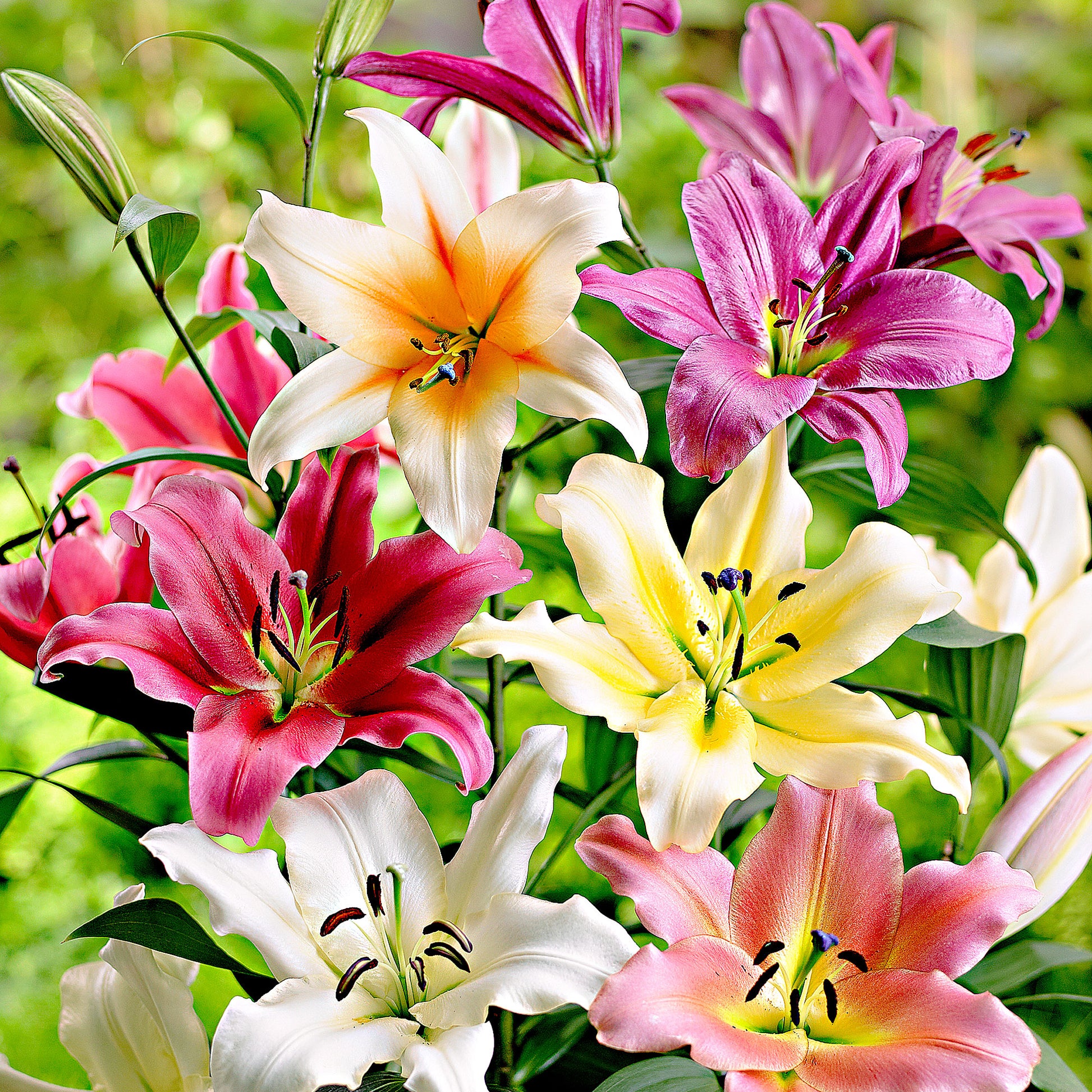 These lilies (Lilium orientalis) consist of new, very tall, oriental lilies. Their stems are strong but will appreciate some help from you in the form of a support. The flower colours range from white to yellow, salmon pink to dusky pink and purple. Did you know that the lily is the symbol of peace? There are many gorgeous, garden varieties of Lilium. Lilies make wonderful cut flowers, quickly filling the living room with a gorgeous fragrance. Be sure to plant a group of lilies in your flower garden. To avoid pollen stains whilst cutting the lilies, make sure the anthers of the flower are facing away from you.