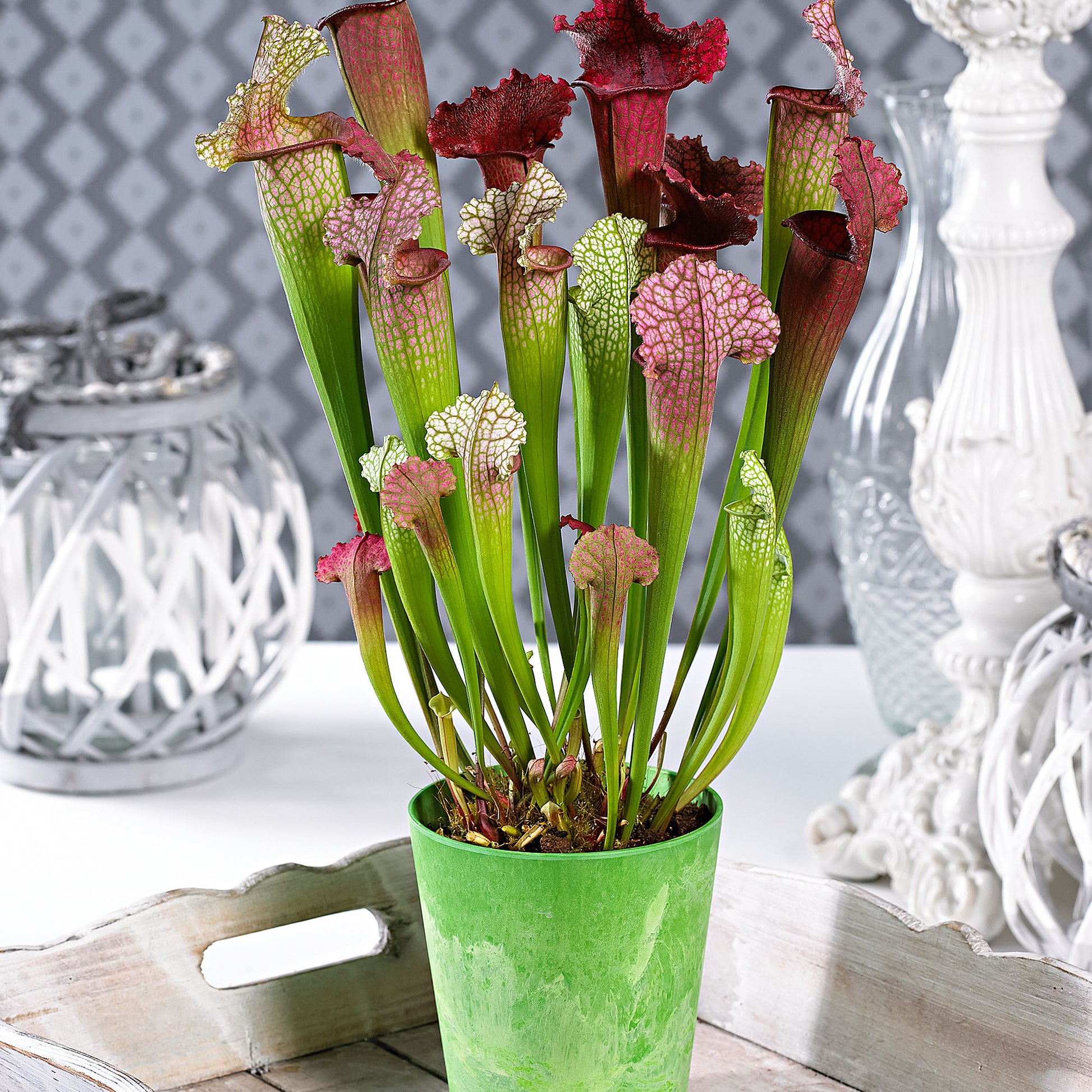 Trouble with insects? The Sarracenia 'Juthatip Soper' eats them up! The plant consists of elongated 'trumpet-shaped pitchers' with an ornamental pattern. This wetland plant loves moist soil. Put the Sarracenia on a dish and pour water over it. Water under the plant, rather than on the plant itself. The pitcher plant likes moderate sunlight, so this plant should not be placed in full sun. Bring it on, flies!
