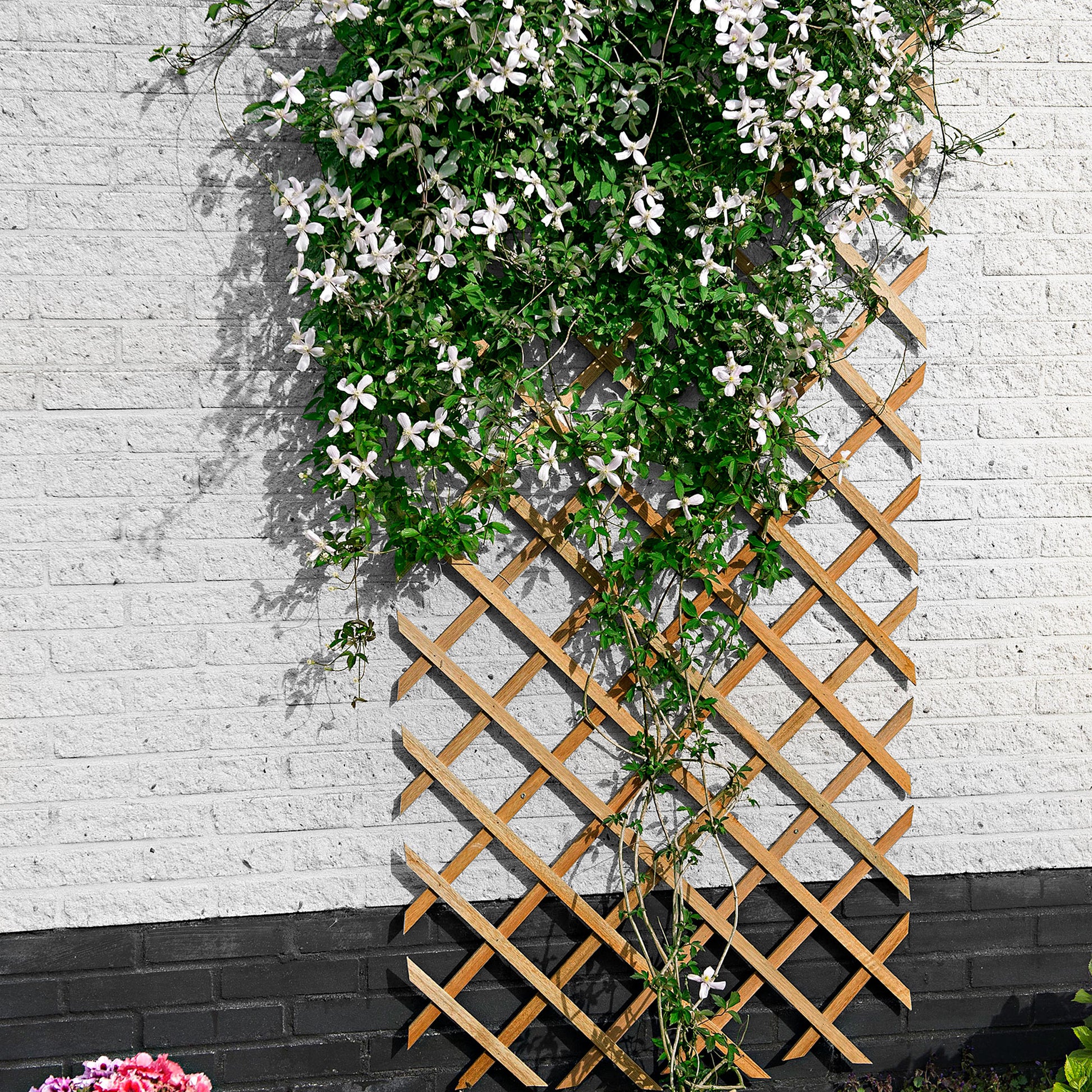 Adjustable wooden trellis. This accordian system makes it possible to adjust the width (or height) of this climbing frame. Perfect for covering a wall, and/or supporting climbing plants. Easily used and easily mounted.