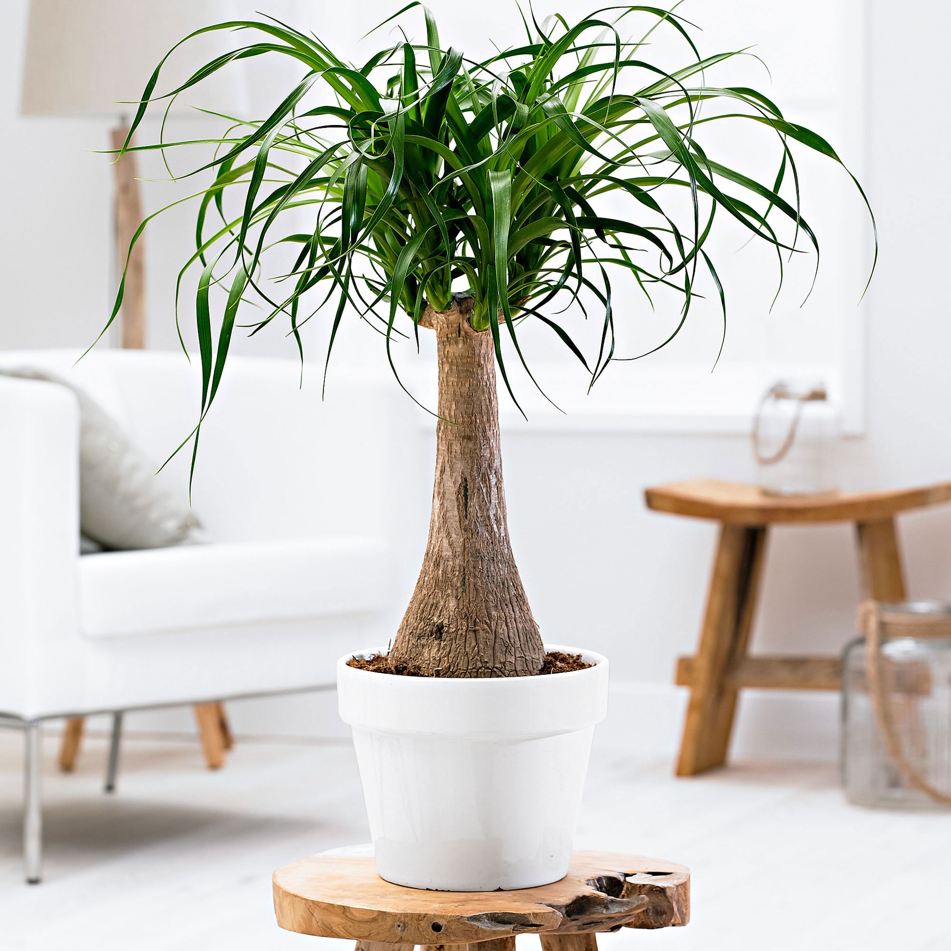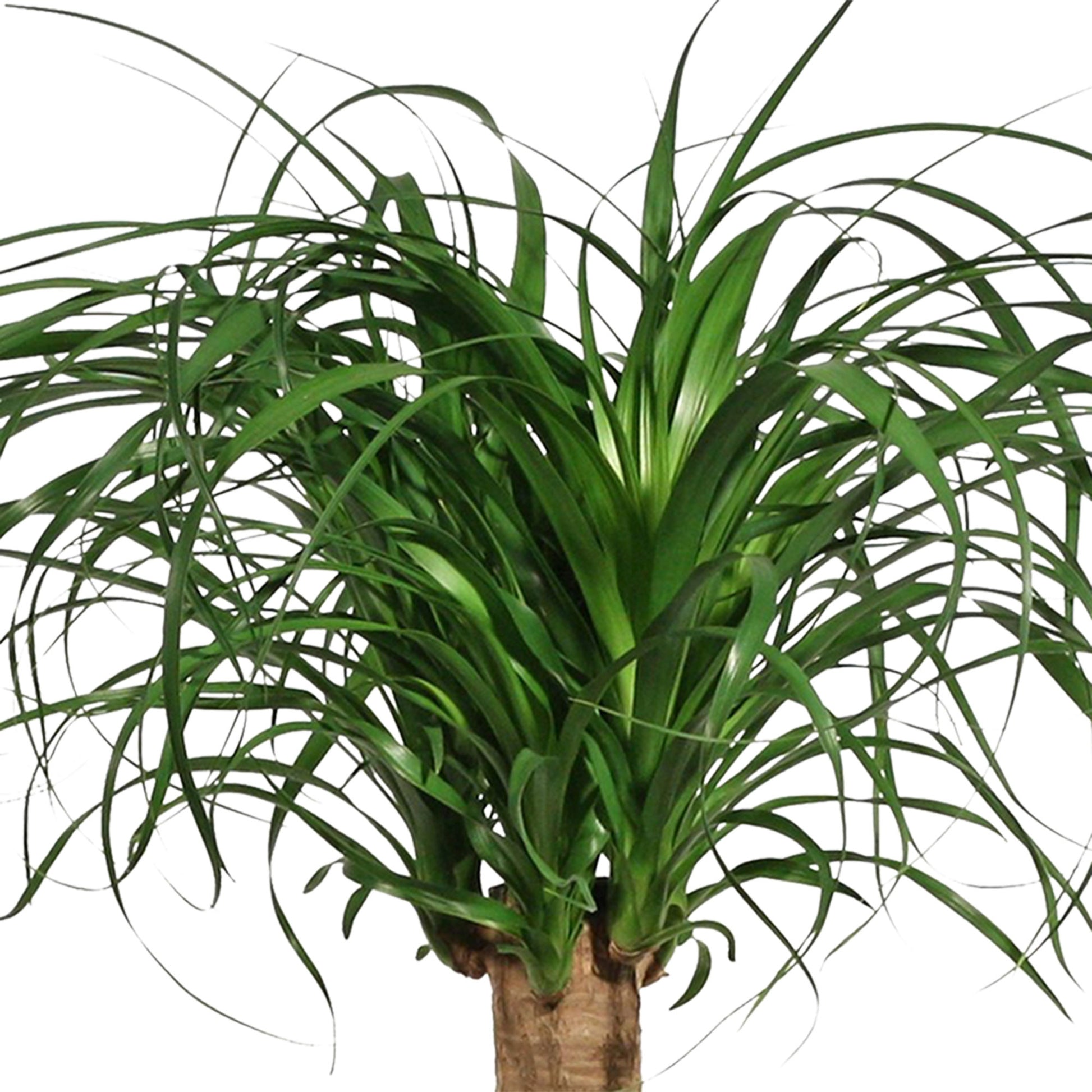 The palm looks just like a ponytail! The Beaucarnea recurvata lives up to its name. Multiple tufts with curling leaves grow on the Ponytail palm. Not only is this strong plant a looker, it's easy to care for! Care of this houseplant is a breeze! Don't water it until the potting soil feels dry to the touch. The Ponytail palm likes plenty of light and can even handle being placed in direct sunlight.