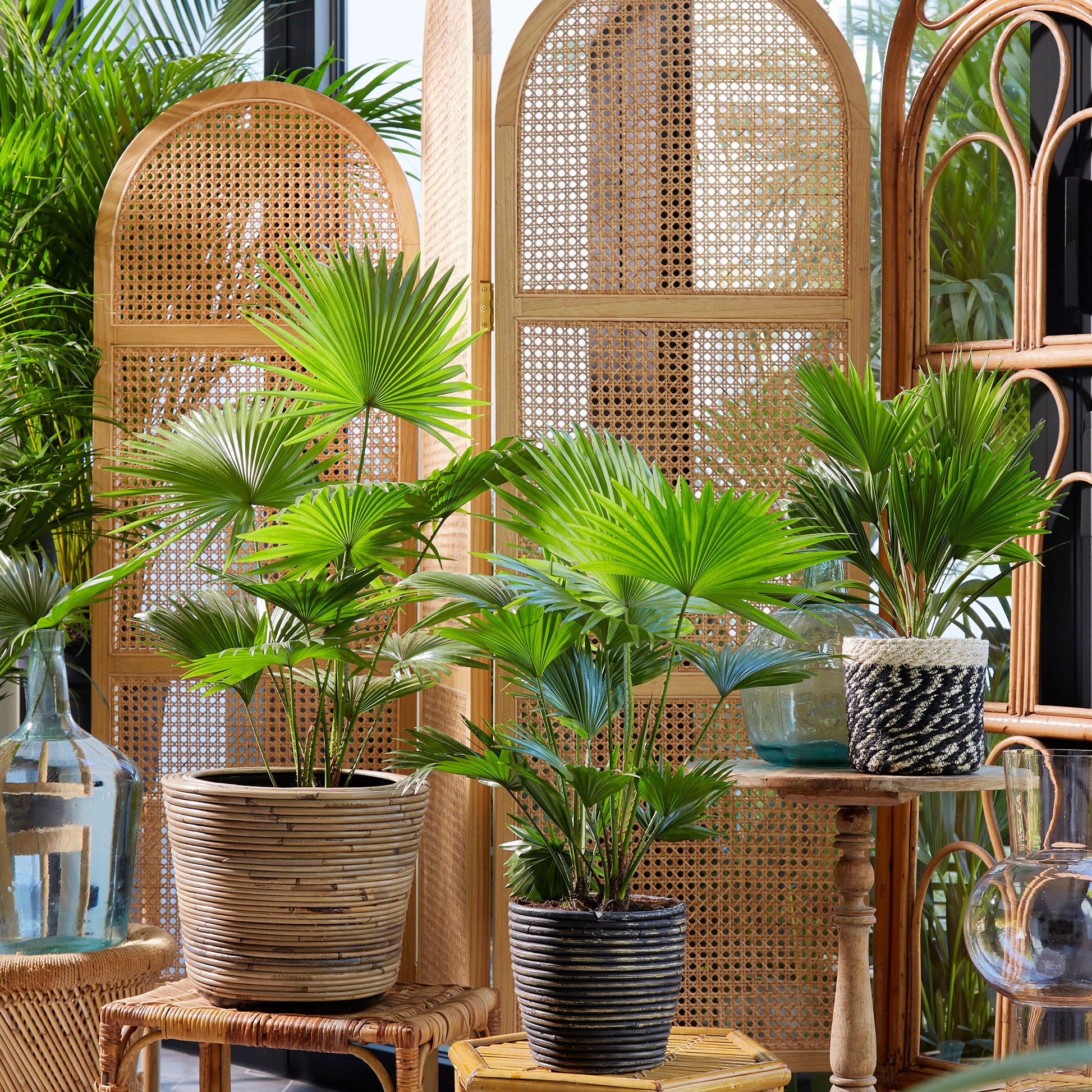 It makes us so happy. An exotic, easy houseplant. The fan palm (Livistona rotundifolia) owes its name to its fan-shaped leaves. The tropical palm also purifies our air! The fan palm is easy to care for. Don't water the plant it until the soil feels dry to the touch. The palm does like lots of light, but not direct midday sunlight.